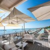 Terrazza sul mare con ombrelloni, sedie e vista su spiaggia attrezzata.