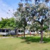 Giardino con alberi fioriti, prato curato e diversi edifici bianchi sullo sfondo.