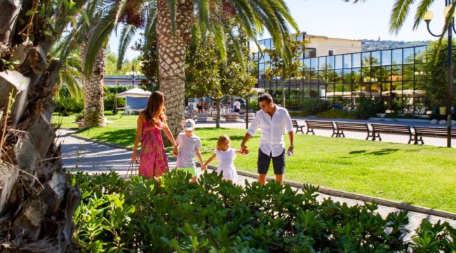Una famiglia cammina in un parco soleggiato con palme, priva di persone intorno.