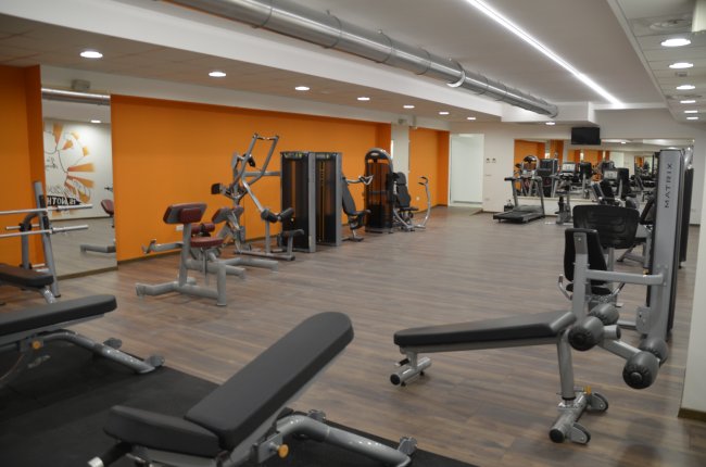 Palestra luminosa con attrezzi per allenamento e decorazioni murali colorate.