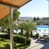 Vista su una piscina affollata circondata da palme e verde, con un campo collinare sullo sfondo.