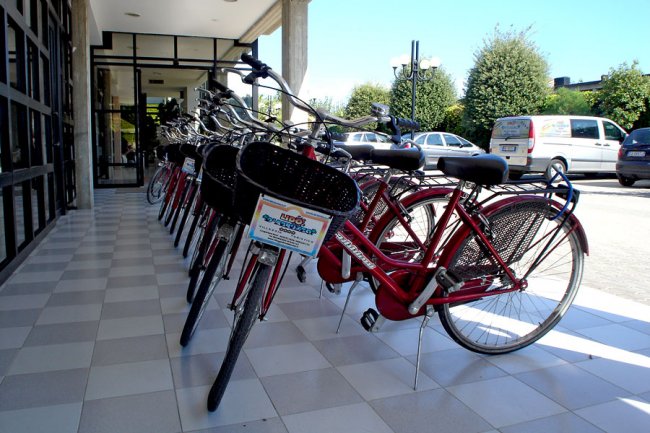 Viale alberato che conduce al mare, con biciclette parcheggiate vicino al cancello.