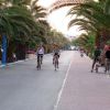 Viale alberato con palme, persone che pedalano su biciclette lungo strada e marciapiede.