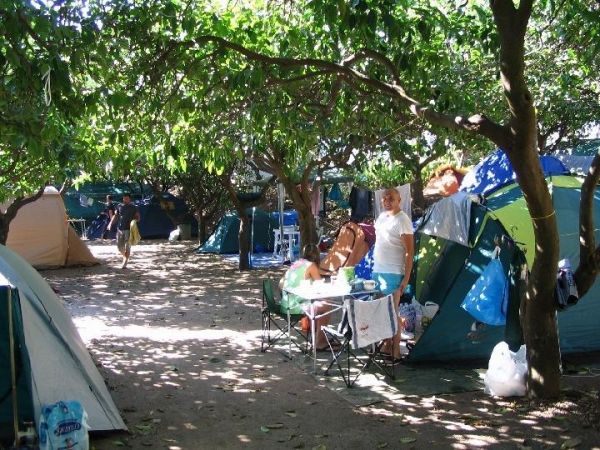 Campeggio all'ombra di alberi, tende e una persona vicino a un tavolino.