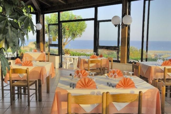 Ristorante con tavoli apparecchiati vicino a finestre, vista sul mare e giardino.