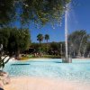 Una piscina con fontane e alberi sullo sfondo.