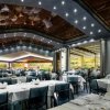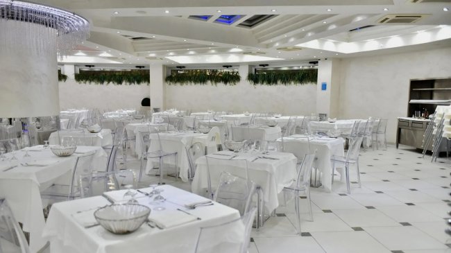 Ristorante elegante con tavoli bianchi e lampadario moderno.