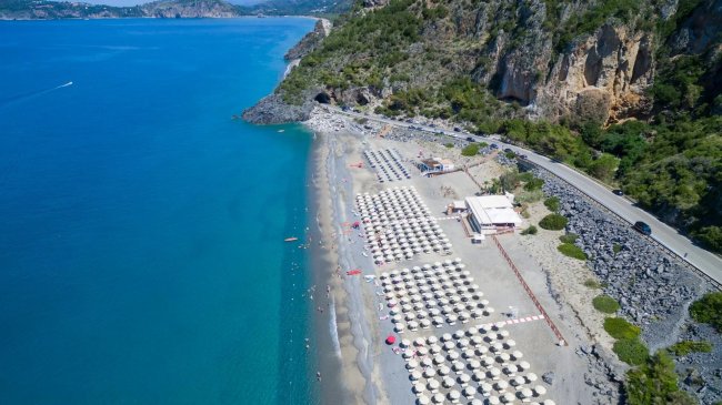 Spiaggia con file di ombrelloni vicino al mare turchese.