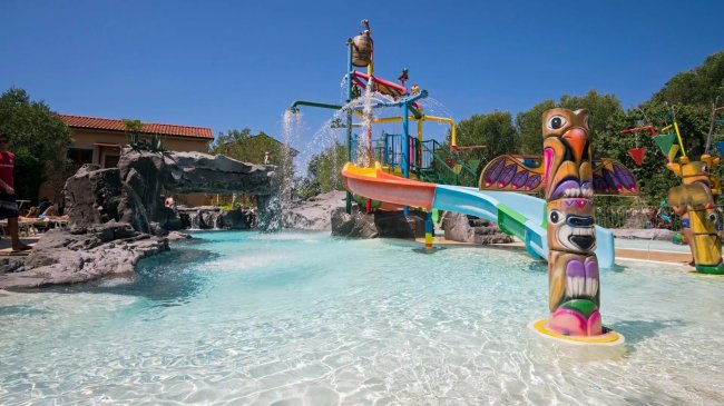 Area giochi acquatici con scivoli e spruzzi.