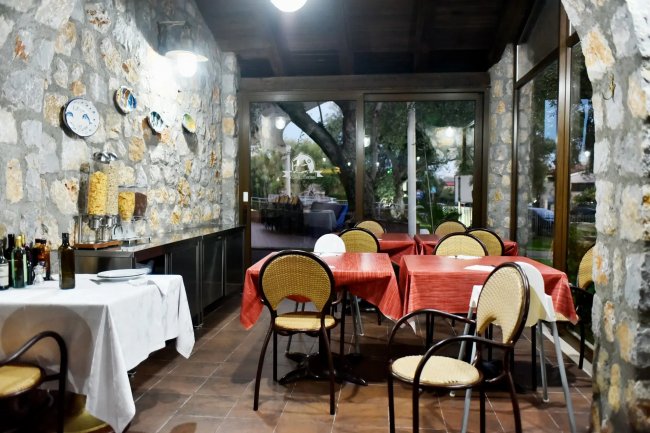 Sala da pranzo rustica con tavoli apparecchiati.