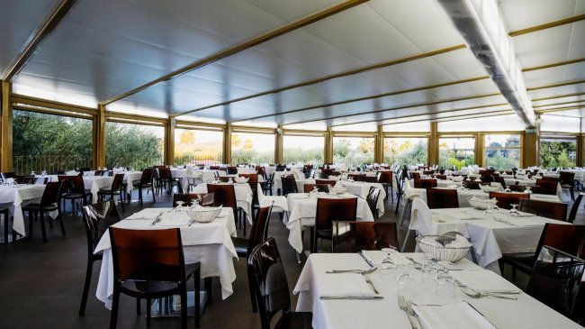 Interno di ristorante elegante con tavoli apparecchiati.