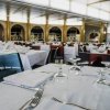 Sala da pranzo con tavoli coperti da un tendone giallo.