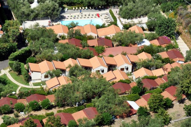 Villette con tetti in tegole circondate da piante e cespugli, cielo parzialmente nuvoloso.