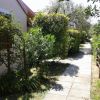 Vicolo acciottolato tra siepi e alberi, accanto a una casa con tetto rosso.