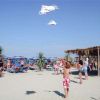 Ragazzi giocano con aquiloni su una spiaggia, con lettini e ombrelloni intorno.