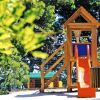 Parco giochi con scivolo arancione e struttura in legno circondato da alberi verdi.