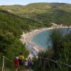 Spiaggia sabbiosa con mare turchese e una scogliera verde ricoperta di vegetazione.