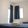 Camera con letto matrimoniale, lenzuola grigie, cuscini blu e bianchi. Finestra con tende grigie.