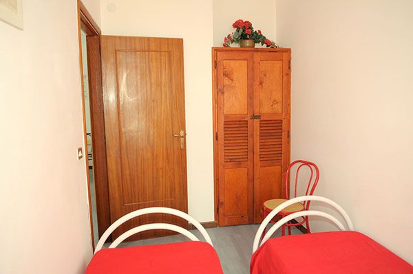 Camera con due letti singoli, armadio in legno, sedia rossa, porta in legno.