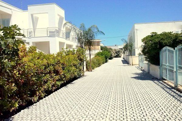 Strada pavimentata tra edifici bianchi e piante, con recinzione metallica.