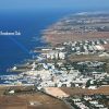 Vista aerea di un complesso residenziale lungo la costa con case bianche e campi.