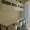 Angolo cottura moderno con mobile bianco e lavandino, accanto a un bagno con muro in pietra.