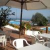 Piscina all'aperto con bagnanti, ombrellone rosso e vista mare.