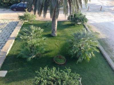 Un giardino curato con palme e cespugli, visto dall'alto.