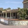 Edificio in pietra con portico e sedie, circondato da piante sotto un cielo blu.