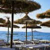 Spiaggia con ombrelloni di paglia e lettini, vista sull'isola all'orizzonte.