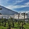 Edificio bianco con arcate, palme e prato verde, montagne sullo sfondo.