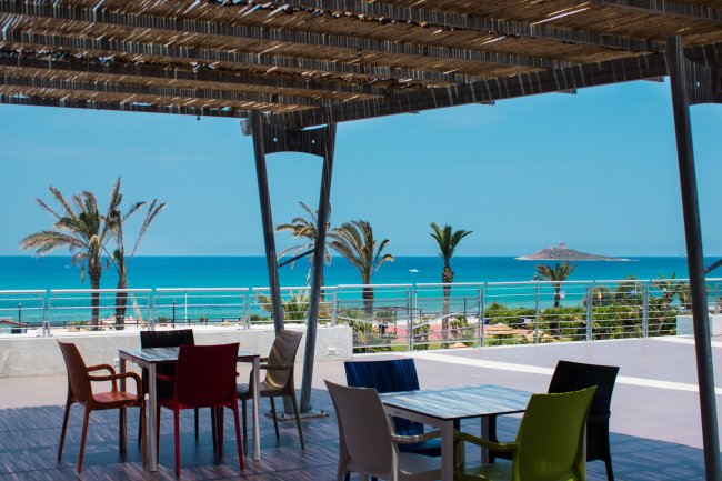 Tavoli e sedie colorate sotto un pergolato con vista sul mare e palme.