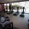 Palestra con tapis roulant e pesi, vista verso l'esterno tramite vetrata.