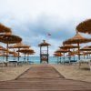 Una spiaggia con ombrelloni di paglia e lettini, cielo nuvoloso sullo sfondo.