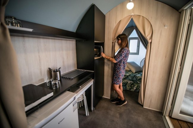 Due persone sedute davanti a una tenda glamping.