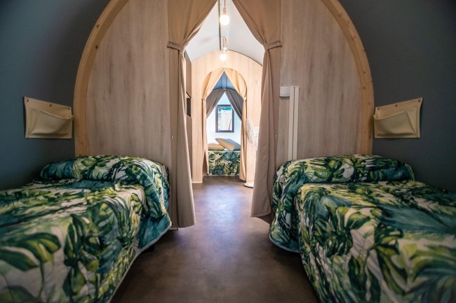 Interno di una tenda con letto e coperte tropicali.