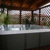 Vasca idromassaggio sotto pergolato con piante intorno.